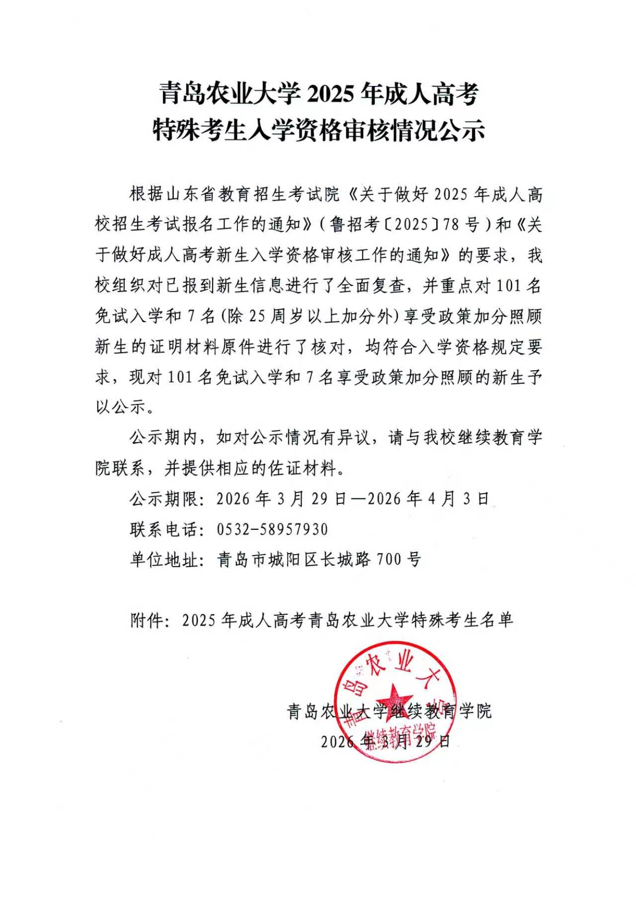 | 青岛农业大学2025年成人高考特殊考生入学资格审核情况公示 更新时间:2026/3/30 12:05:00 |