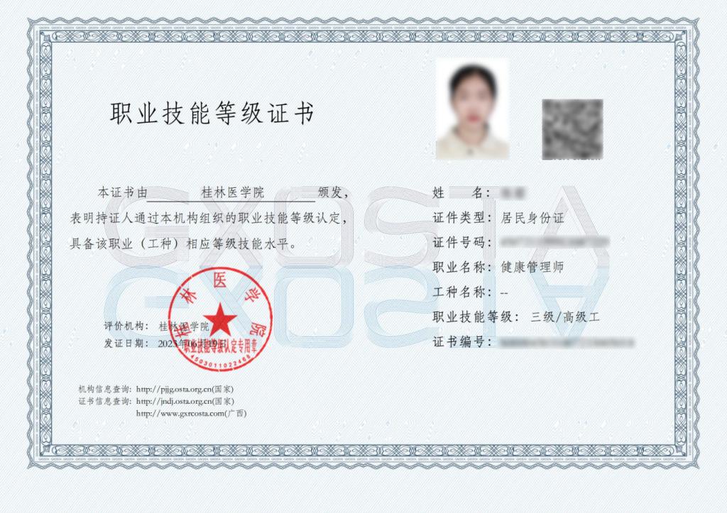 学员培训合格可取得三项证书:健康管理师+公共营养师+心理专项 1.培训费:个人报名 2680元/人/次; 组团报名 3人成团2500元/人/次,10人以上团体报名咨询郑老师。 2.评价费:根据《广西壮族自治区人力资源和社会保障厅关于调整职业技能鉴定收费项目及标准的通知(桂人社规〔2020〕14号)》文件,健康咨询服务人员属于D类职业,考试评价收费标准为中级247元/人/次 ;高级 :292元/人/次;专项能力:185元/人/次 五、报名方式 有意向报名的学员,通过微信扫描以下二维码填写报名表完成报名。 ![]() 六、缴费方式 经审核学员报名材料,符合培训及报考资格者,学院发送报名确认单,学员根据说明缴费至桂林医科大学财务处。 七、报名咨询 1.地址:桂林市七星区环城北二路109号桂林医科大学继续教育学院; 2.咨询电话:0773-8989020 冷老师 18172635889 郑老师 证书样本 ![]() ![]() ![]() ![]() 一审:王欣 二审:李勇 三审:龙 亮 一校:冷国钰 二校:黄开西 三校:蒋妮娜 桂林医学院成人高考网上报名入口 |