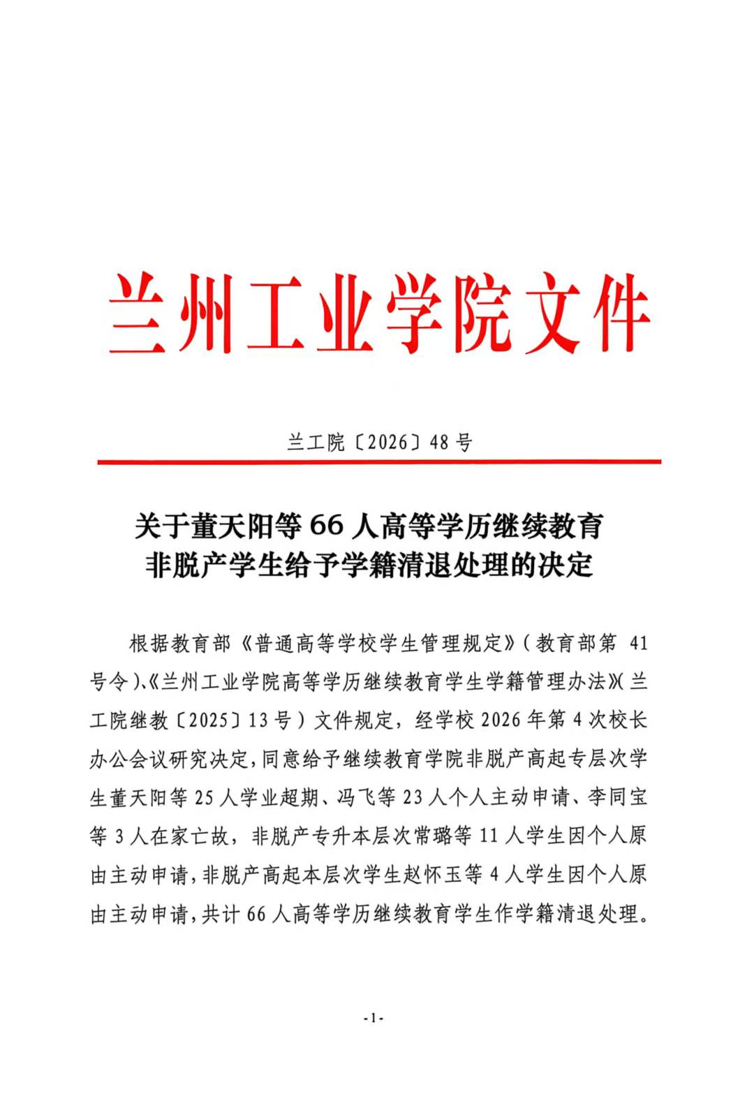 | 关于董天阳等66人高等学历继续教育非脱产学生给予学籍清退处理的决定 更新时间:2026/4/7 14:40:00 |