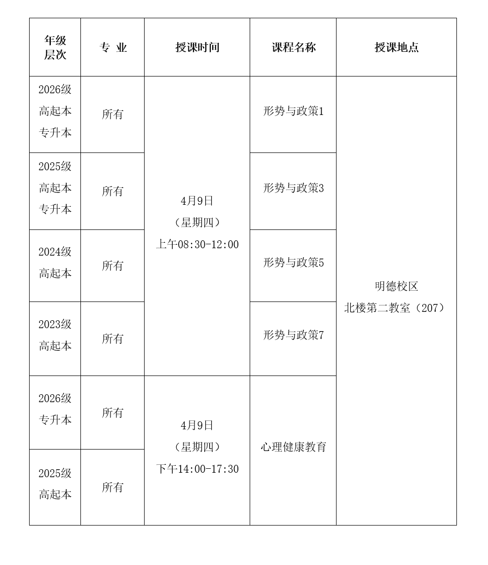 | 2026年春季学期第五次(4月9日)线下教学课程表 更新时间:2026/4/7 14:41:00 |